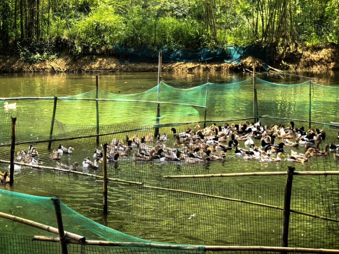 珍珠鸭养殖基地是村集体经济的结晶之一。珍珠鸭是大新县具有代表性的特色农产品,具有“嘴短头短身子短腿短”的特点,憨态可掬,十分可爱。基地坐落于幽静的山间,绿水潺潺,清风袅袅,其中共养殖有3000只左右珍珠鸭,规模较大,源源不断地输出优质食材。据介绍,珍珠鸭身材小巧,但是收益和利润很高。一只珍珠鸭一般只能长到2.5至3斤左右。该基地常常以一公一母成对出售,目前市场售价298一对,凭借优良的质量和鲜嫩的口感赢得消费者喜爱。饲养人员将种鸭与肉鸭分开养殖,既保证了品质的规范,又可以不断扩大规模,实现可持续发展。