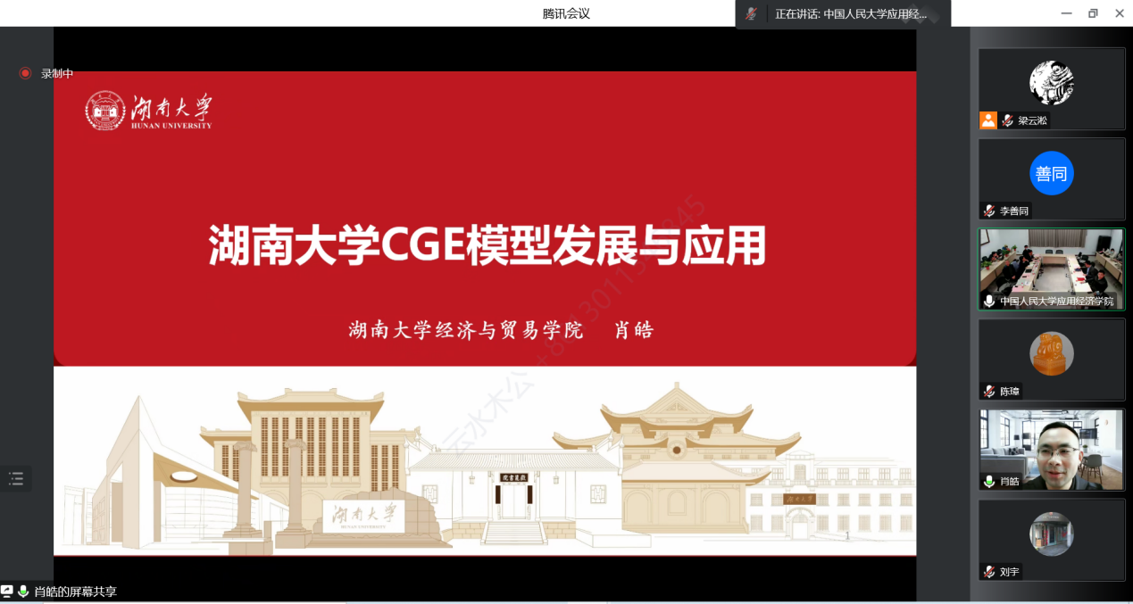 肖皓以“湖南大学CGE模型发展与特色”为题展开报告。他从模型特征、数据、原理、应用等方面详细介绍了湖南大学CGE模型。