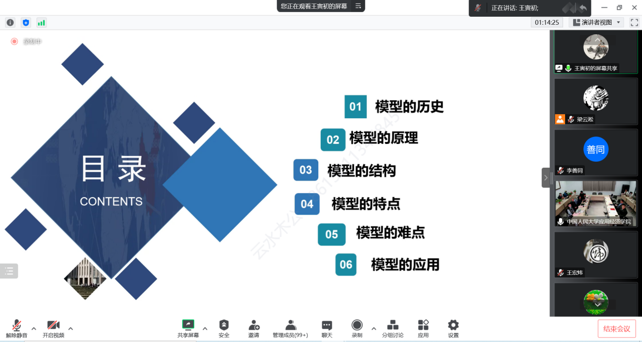 王寅初以“‘牡丹’(MUDAN-The Multisectoral Development Analysis Model for China)简介”为题展开报告。他分别从历史、原理、结构、特点、难点、应用等六个方面介绍了“MUDAN模型”。