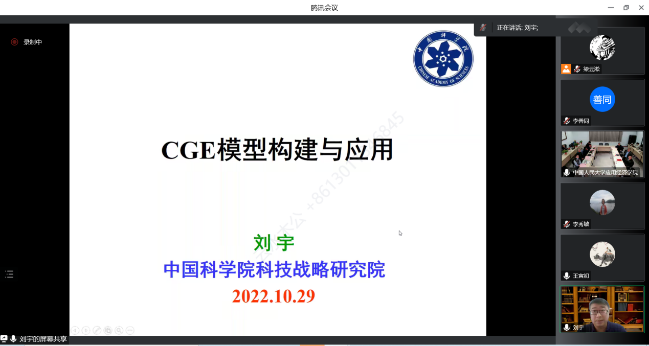 刘宇以“CGE模型构建与应用”展开报告。他介绍了CGE模型的发展历史、原理、结构,以及发展方向、最新进展和面临的挑战。
