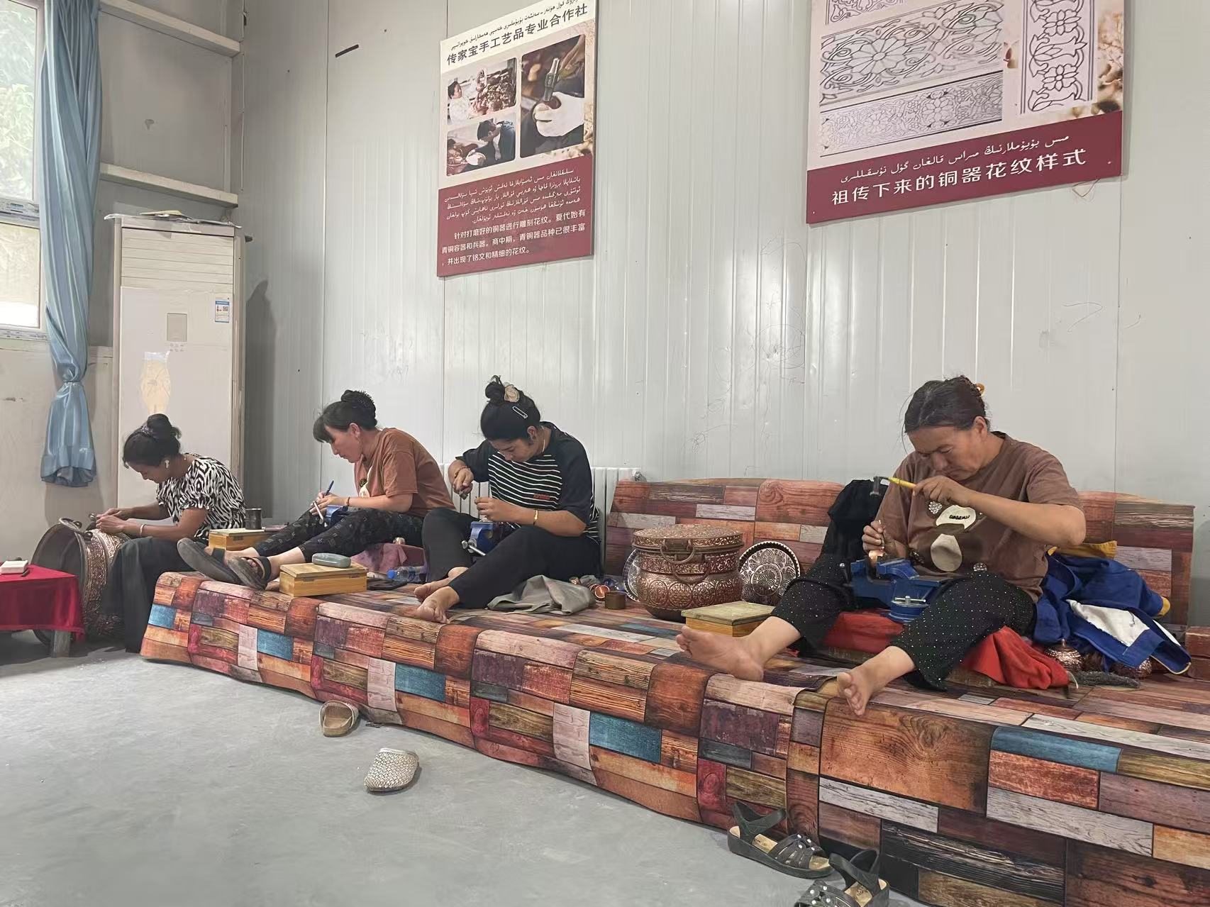 期间,调研团抵达恰尔巴格镇加依托格拉克村传家宝手工艺品专业合作社,调研手工艺品专业合作社传统手工艺保护、助力产业发展情况。该合作社致力于传承和发展传统手工铜器制作技艺,于2010年被列入和田地区非物质文化遗产代表性项目,为传承和弘扬地方传统文化做出了积极贡献,产品主要销往阿克苏、喀什、乌鲁木齐等地。合作社采取“合作社+农户”的经营模式,带动当地群众在家门口实现稳定就业,目前现有员工18人,人均工资2700元,带动村集体经济每年稳定增收12万元。