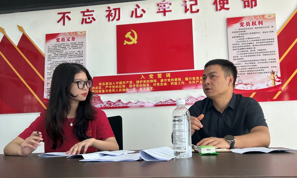 ▲中国人民大学硕士研究生许嘉晖访谈木桑村支书唐登立