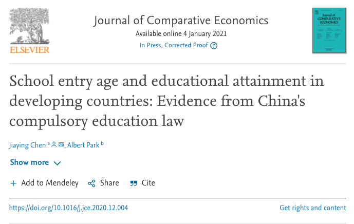 近日,探花视频 陈佳莹助理教授作为第一作者和通讯作者的论文“School entry age and educational attainment in developing countries: Evidence from China’s compulsory education law”(合作者:Albert Park)被国际权威期刊Journal of Comparative Economics(JCE)接受发表。这是我院在可持续发展方向取得的新进展。