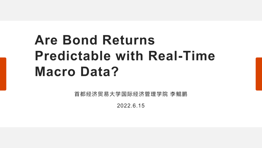 主讲嘉宾为首都经济贸易大学国际经济管理学院院长、教授李鲲鹏。李鲲鹏以“Are Bond Returns Predictable with Real-Time Macro Data?”为题进行了分享。他提出了一种新的预测方法,用以在明确考虑预测目标与潜在因素之间的非线性关系以及弱因素存在的情况下,考察实时宏观变量是否可以预测债券收益。他发现,将该方法应用于政府债券收益,具有显著的样本内和样本外预测能力,产生了可观的经济价值。随后,他详细介绍了所担任主编的期刊接收文章的主要方向和要求。