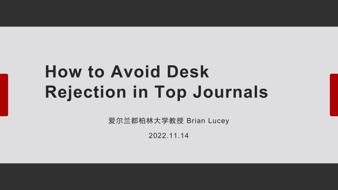 主讲嘉宾为爱尔兰都柏林圣三一学院教授Brian Lucey。Brian Lucey以“How to Avoid Desk Rejection in Top Journals”为题进行了分享。他从期刊主编的角度分享了自己的观点,提出了许多有价值的参考建议。他认为,为了避免投稿被拒,需要做到选题时清晰明了、大胆创新、目标明确,文章一致完整、逻辑通畅、方法正确,而投稿人自身也要对研究保持诚信的态度,不弄虚作假。最后,他就投稿信的注意事项和推荐审稿人的选择等方面进行了交流,并再次强调了在进行论文写作和投稿时突出文章主旨和注意细节的重要性。