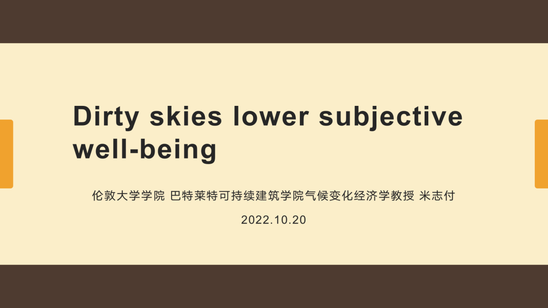 主讲嘉宾为伦敦大学学院教授米志付。米志付以“Dirty skies lower subjective well-being”为题进行了分享。该研究主要围绕我国居民的主观幸福感与空气污染物浓度的关系展开,运用了情感分析法,并基于百度搜索词去构建主观幸福感指数。结果表明,居民的主观幸福感与空气污染物的浓度呈负相关,且和季节有着一定关系,在炎热的夏天这种关系会更显著。同时,城市富裕的程度也会影响居民对于空气污染物的敏感度,越富裕的城市敏感度越高。随后,他介绍了其担任主编的期刊《Structural Change and Economic Dynamics》,并说明了文章发表的注意事项等。
