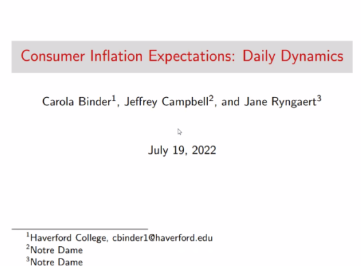主讲嘉宾为哈弗福德学院副教授Carola Binder。Carola Binder以“Consumer Inflation Expectations: Daily Dynamics”为题进行了分享。她介绍了一种高频识别方法用以研究许多不同类型事件对消费者通货膨胀预期的影响,并对每个事件的影响进行了单独回归分析。联邦公开市场委员会的大多数会议对消费者通胀预期没有显著影响;关于新冠疫情Covid-19的好消息往往会降低通胀预期;而当新闻报道发布好于预期的美国非农就业数据时,通胀预期出现几次大幅下降。她基于不同日期的调查结果,研究高频率新闻对通胀预期的影响,并将成果用于SCE月度调查,为学院师生提供了新的研究方法与思路。
