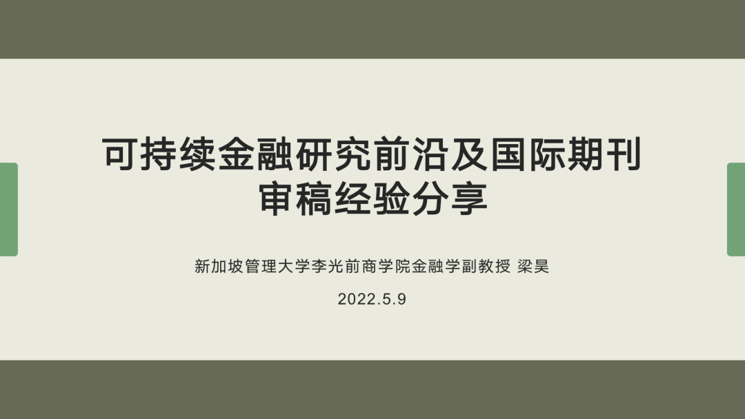 主讲嘉宾为新加坡管理大学副教授梁昊。梁昊以“可持续金融研究前沿及国际期刊审稿经验”为题进行了分享。他围绕可持续金融相关研究问题的现状和学术前沿、个人科研经历以及国际顶级期刊论文发表经验展开,梳理了可持续金融的热门概念及其联系,从金融学角度结合相关文献介绍了对ESG的认识,讲解了学术研究中ESG度量的数据处理、比较和挑战,提出了在研究发现中的重要问题,并结合相关文献做出总结。随后,他介绍了国际经管期刊的审稿流程,以及期刊对金融学、会计学、管理学学术论文发表的要求,并提出相关建议,最后对学院师生提出的问题进行了详细解答。