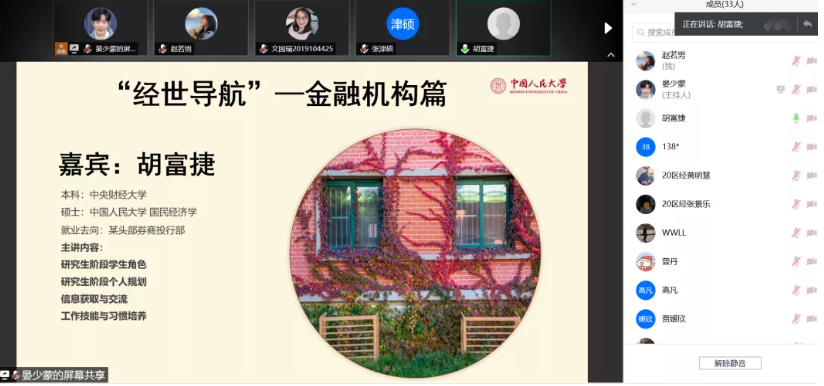 邀请2006届国民经济管理探花视频 陈鉴姝为大家分享面试技巧与经验,在面试准备和面试技巧等方面提供丰富的经验,吸引了院内外同学的广泛参与。