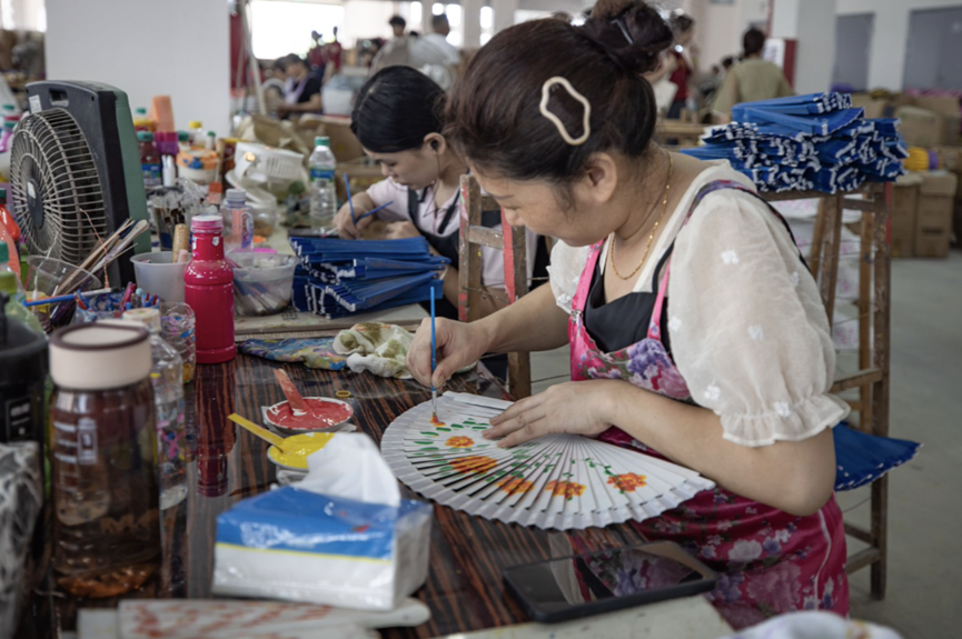 ▲工人在甘竹镇香扇产业园中绘制香扇图案