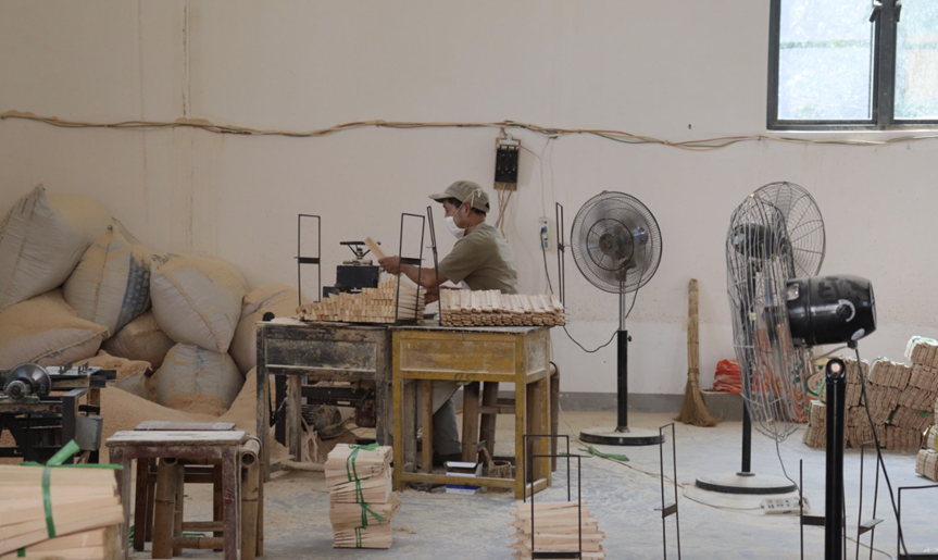 ▲工人在甘竹镇香扇产业园中制作扇柄