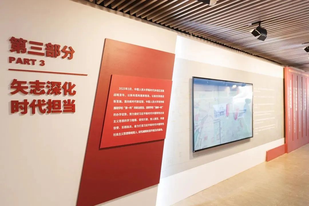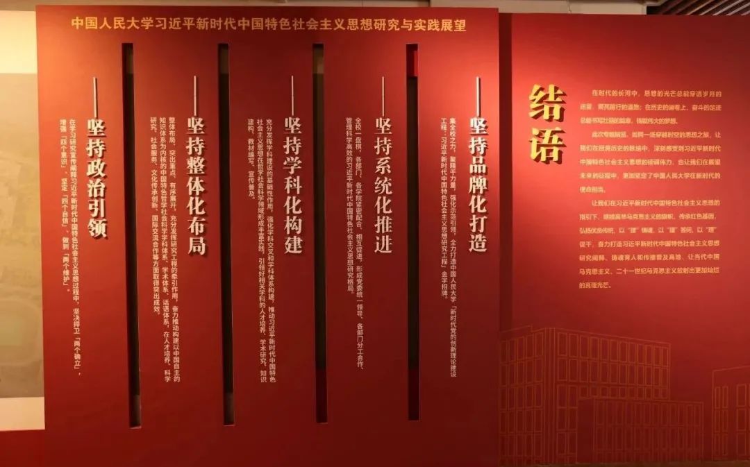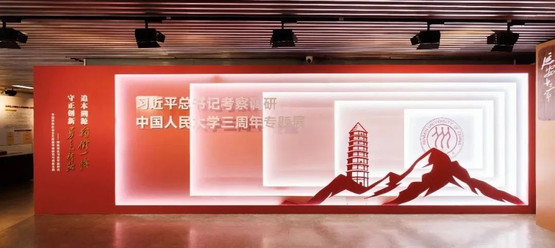 “追本溯源‘独树一帜’,守正创新‘勇走新路’——持续深化习近平新时代中国特色社会主义思想学理研究与创新实践”习近平总书记考察调研中国人民大学三周年专题展共分为“马克思主义理论重镇与学科高地”“举旗帜 当先锋 作示范”“矢志深化 时代担当”三大部分,全面呈现了中国人民大学推进马克思主义中国化时代化的理论研究与实践探索,特别从四个方面展示了中国人民大学大力推进习近平新时代中国特色社会主义思想学理研究与创新实践的丰硕成果,并展望了中国人民大学面向新时代新征程的多校区发展战略布局。