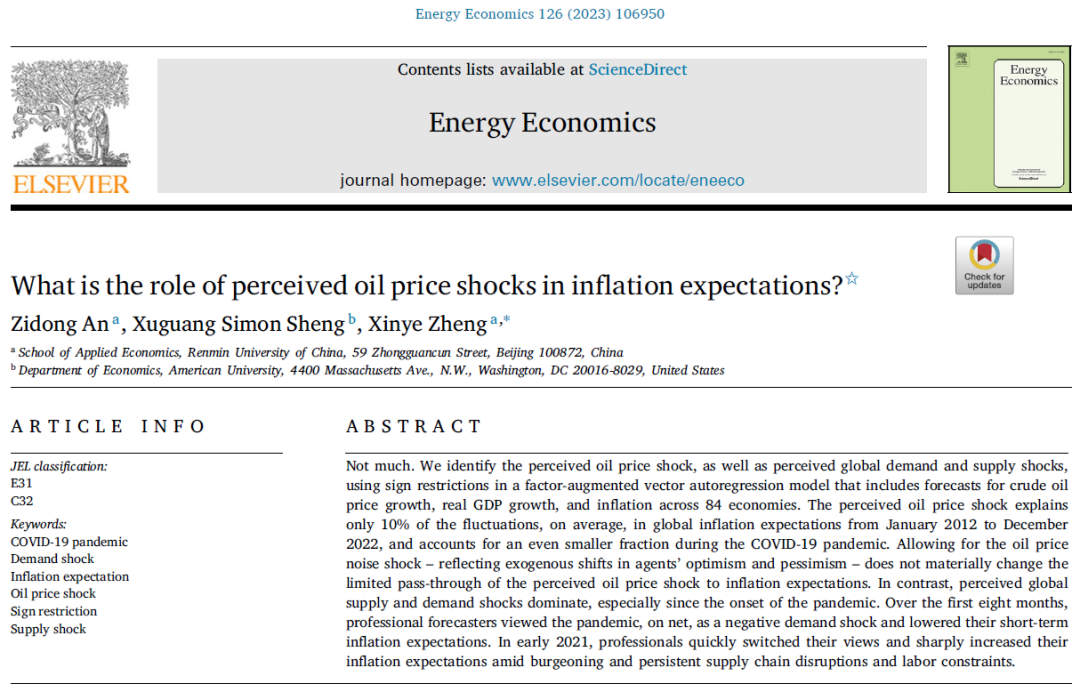 近日,探花视频 郑新业教授、安子栋副教授与美国大学(American University)盛旭光教授的研究成果“What is the role of perceived oil price shocks in inflation expectations?”被国际权威期刊Energy Economics接受发表。该研究依托国自科重点项目“双碳目标下资源环境经济协同发展研究”和中国人民大学社会调查项目“中国家庭宏观经济预期调查研究”,郑新业教授为通讯作者,安子栋副教授为第一作者。