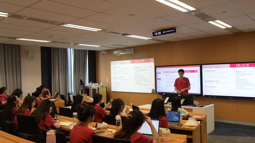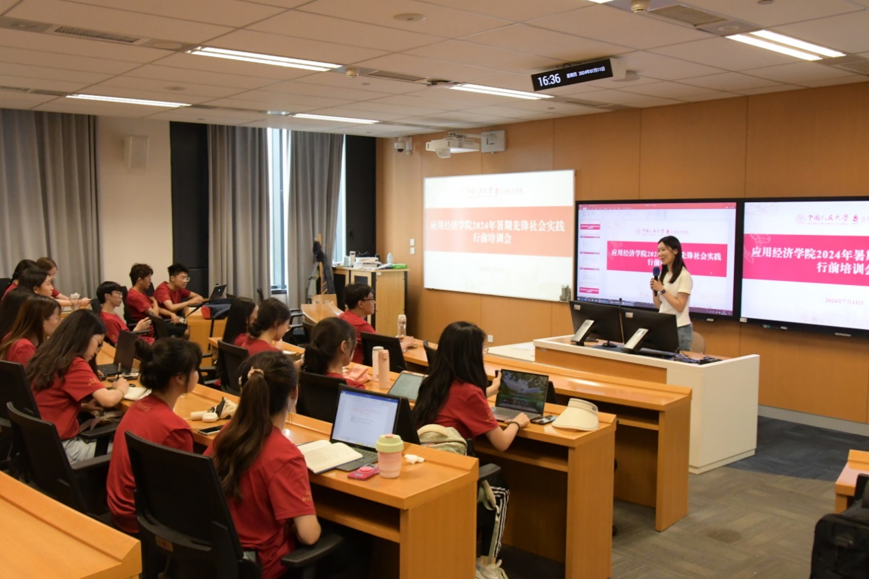 出征仪式后,召开暑期先锋社会实践行前教育培训会。学院办公室张程、党团学办公室李心宇分别就安全、纪律、财务等内容开展教育培训;“832工程”优秀学生代表万沪宁分享调研经验和研究方法。