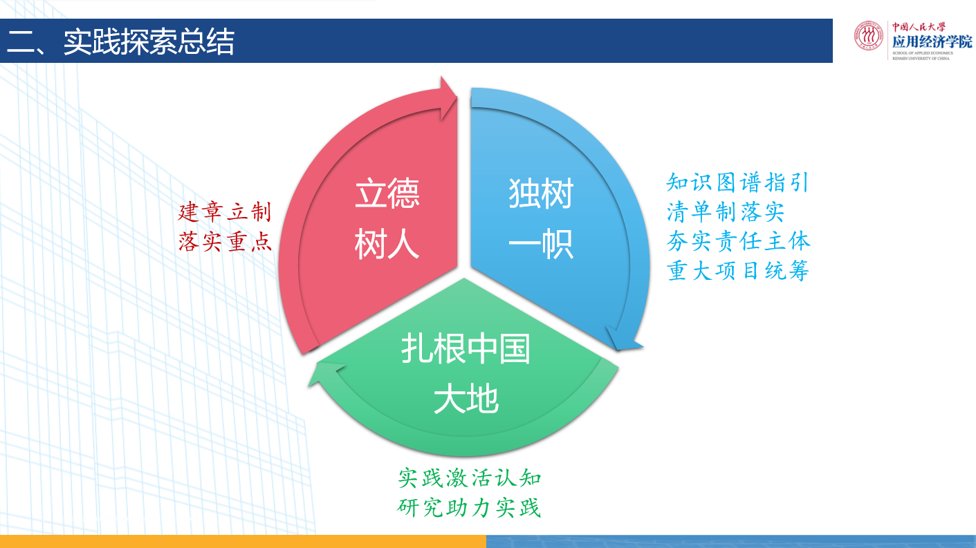 学院自2019年成立以来,紧紧围绕“立德树人”根本任务,坚持遵循“扎根中国大地办教育”,通过“知识图谱指引”“清单制落实”“夯实责任主体”“重大项目统筹”等方式,致力于建立“独树一帜、中国特色世界一流”的应用经济学研究生培养方案。在学校领导、研究生院、学校其他各部门的帮助指导下,学院“独树一帜”的应用经济学研究生培养体系初步建成,逐步形成有价值、可复制、可推广的应用经济学研究生培养“人大方案”,通过创办“一会、一刊”服务“一组”(学科评议组),力争在提升人大影响力方面贡献属于自己的力量。