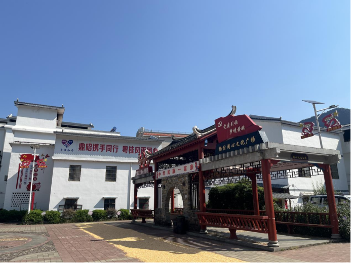 ▲调研团在昭平县黄姚镇移民安置小区的美术馆前合影