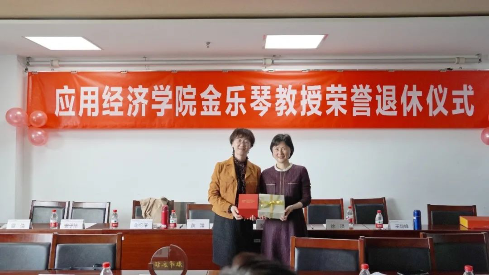 郑新业和宋东霞代表学院分别为金乐琴颁发荣退牌匾和纪念品,青年教师曹佳献花。