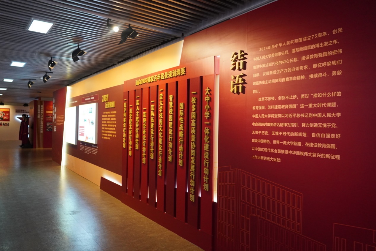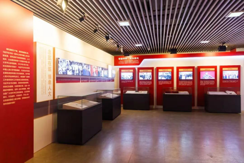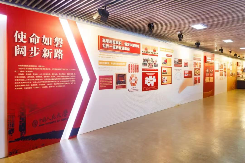 “习近平总书记考察调研中国人民大学两周年 走出一条建设中国特色世界一流大学新路”主题展共分为“领袖关怀 殷殷嘱托”“使命如磐 阔步新路”“百年奋斗 迈向一流”三大部分,全面展现了习近平总书记对中国人民大学的特殊关心、对人大师生的亲切关怀,并从八个方面回顾了两年来学校坚定不移走好建设中国特色、世界一流大学新路的奋斗足迹,展望了学校面向2037建校百年远景规划。