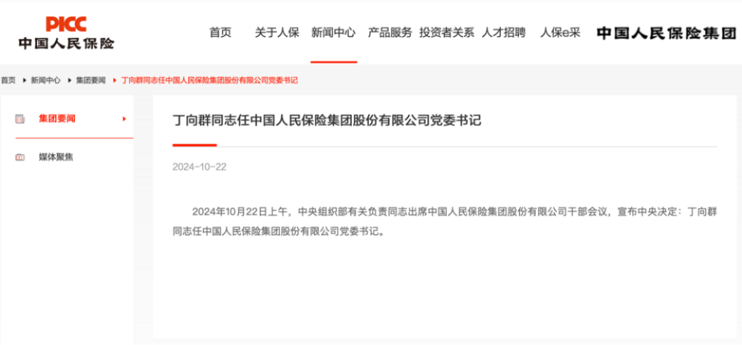 据中国人民保险集团官网消息,10月22日上午,中央组织部有关负责同志出席中国人民保险集团股份有限公司干部会议,宣布中央决定:丁向群同志任中国人民保险集团股份有限公司党委书记。