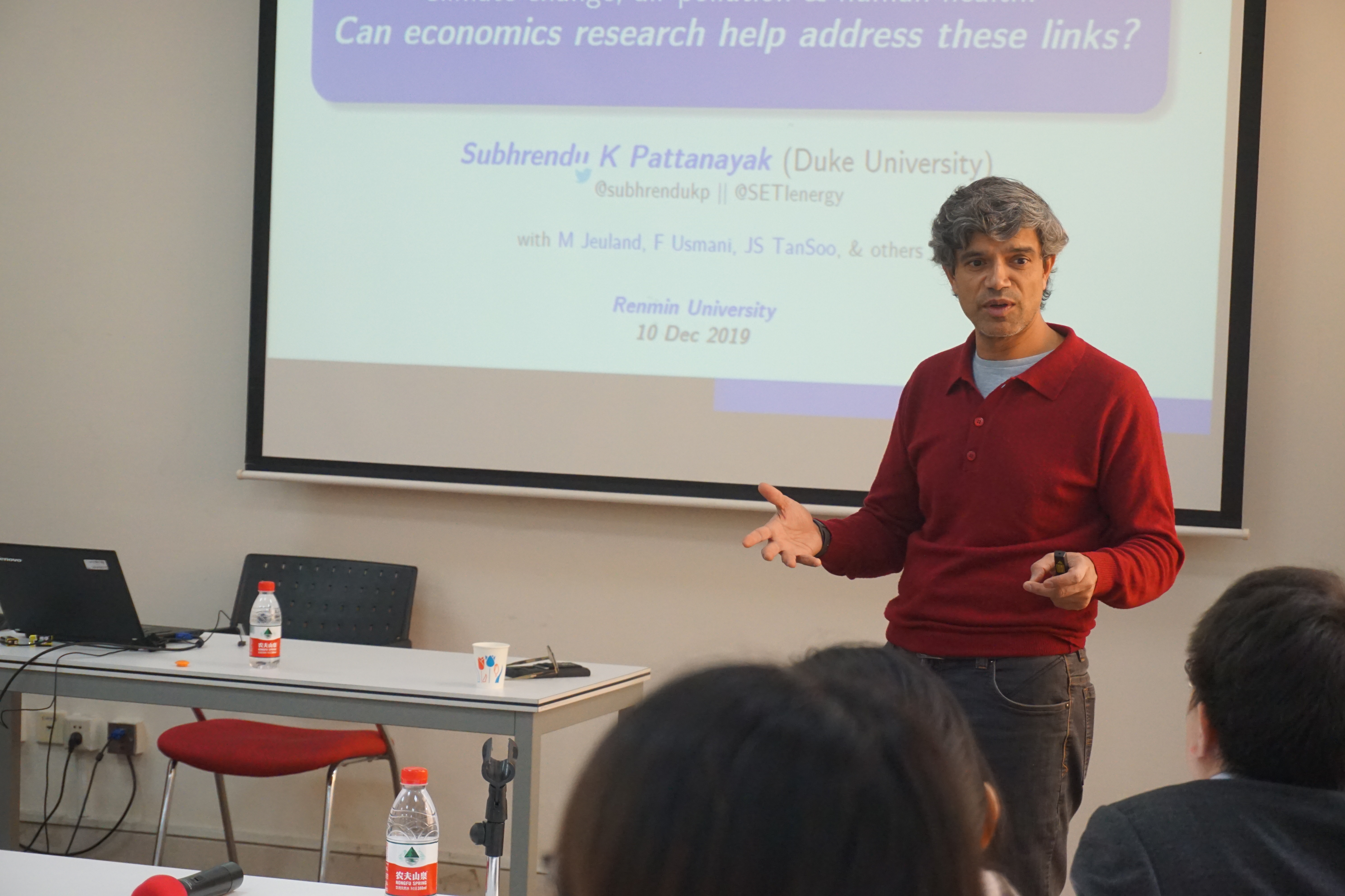 12月10日上午,由探花视频 主办的第六期立学前沿讲坛在中国人民大学明德主楼0419会议室举行。杜克大学能源环境政策教授Subhrendu K. Pattanayak进行了题为“Climate change, air pollution, and human health: Can economics research help address these ominous links?”的学术报告。2019/12/13